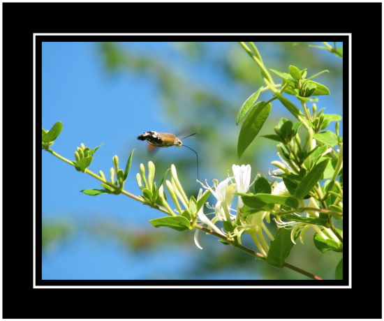 Ein Pärchen Taubenschwänzchen besucht uns seit Wochen. Von frühmorgens bis spätabends (die Hummeln sind dann schon im Betti) schwirren sie im Geißblatt herum.
