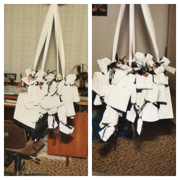 Das war ein Korbkranz der mit Bändern an der Decke befestigt wurde und an diesem Kranz hingen 24 kleine Päckchen.  Sehr unscharf die alten Fotos, aber ein bisserl kann man es erkennen.
