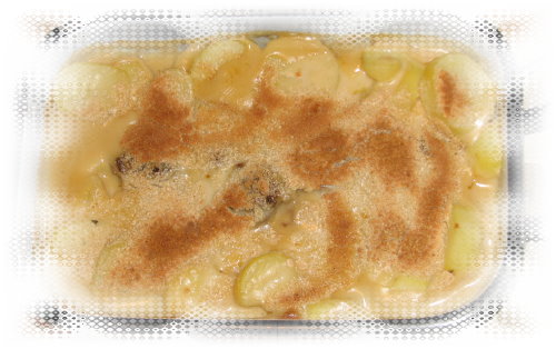 Hackfleischbällchen mit Kartoffeln und mit Sahne und Käse überbacken.