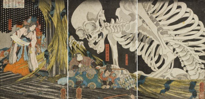Das Triptychon erzählt die Geschichte des Helden Ōyatarō Mitsukuni, der mit seinem Schwert den bösen Araimaru zu Boden zwingt. Damit bannt er das gigantische Skelettgespenst, das von der Magierin Takiyasha-hime (links im Bild) heraufbeschworen wurde, und der Zauberpalast des Masakado fällt in sich zusammen. Kuniyoshis meisterliche visuelle Umsetzung eines Romans von Santō Kyōden (alias Kitao Masanobu!) verweist bereits auf Prinzipien der Bildaufteilung im modernen Manga. (Quelle: Ukipedia)