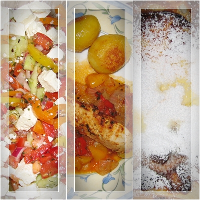 Gekochtes Huhn wird auf einem Tomaten-Paprika-Bett geschmort. Mit Röstkartoffeln hab ich das ganze auf den Tisch gebracht. Geschmacklich hat es uns so ein wenig an das ungarische Letscho erinnert und es war wirklich sehr sehr lecker.