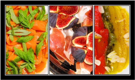 Carote in agro (Piemont) - Prosciutto e fichi - Feigen mit San Danieleschinken (Friaul) - Antipasto di peperoni (Piemont)