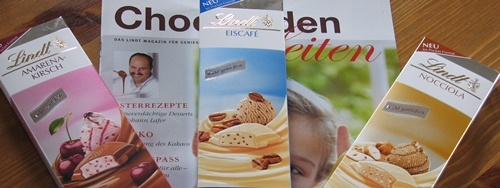 Ende März kam hier ein süsses Paket an mit 3 Tafeln Lindt-Schokolade in den neuen Sorten Amarena-Kirsch, Eiscafé und Nocciola. Für diese neuen Sommertafeln haben sich die Maîtres Chocolatiers von Lindt von Eis-Spezialitäten inspieren lassen und ist deshalb genauso wie Eis am besten frisch gekühlt zu genießen.